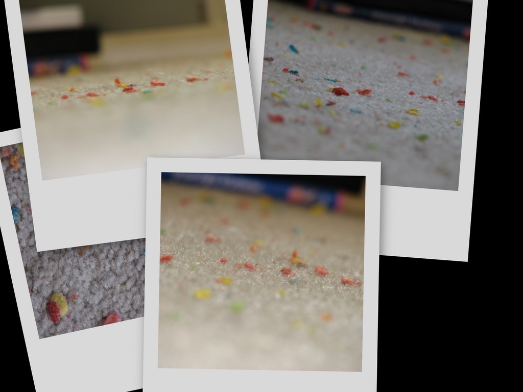 Here are some pictures of the Fruity Pebbles that the kids left behind on the carpet after Saturday morning cartoons. For those of you that are unschooled in the fine art of cereal, Fruity Pebbles are some of the smallest pieces of cereal that one can buy. For that reason, I guess I can’t be too angry that the girls spilled a few. Besides, all it takes is a vacuum to clean this one up. That is nothing compared to a lot of the other things that I clean up around here (like 1 cup of hot cocoa that toppled all over my pile of clean dishes this morning – I have a hard time with my coordination early in the morning)